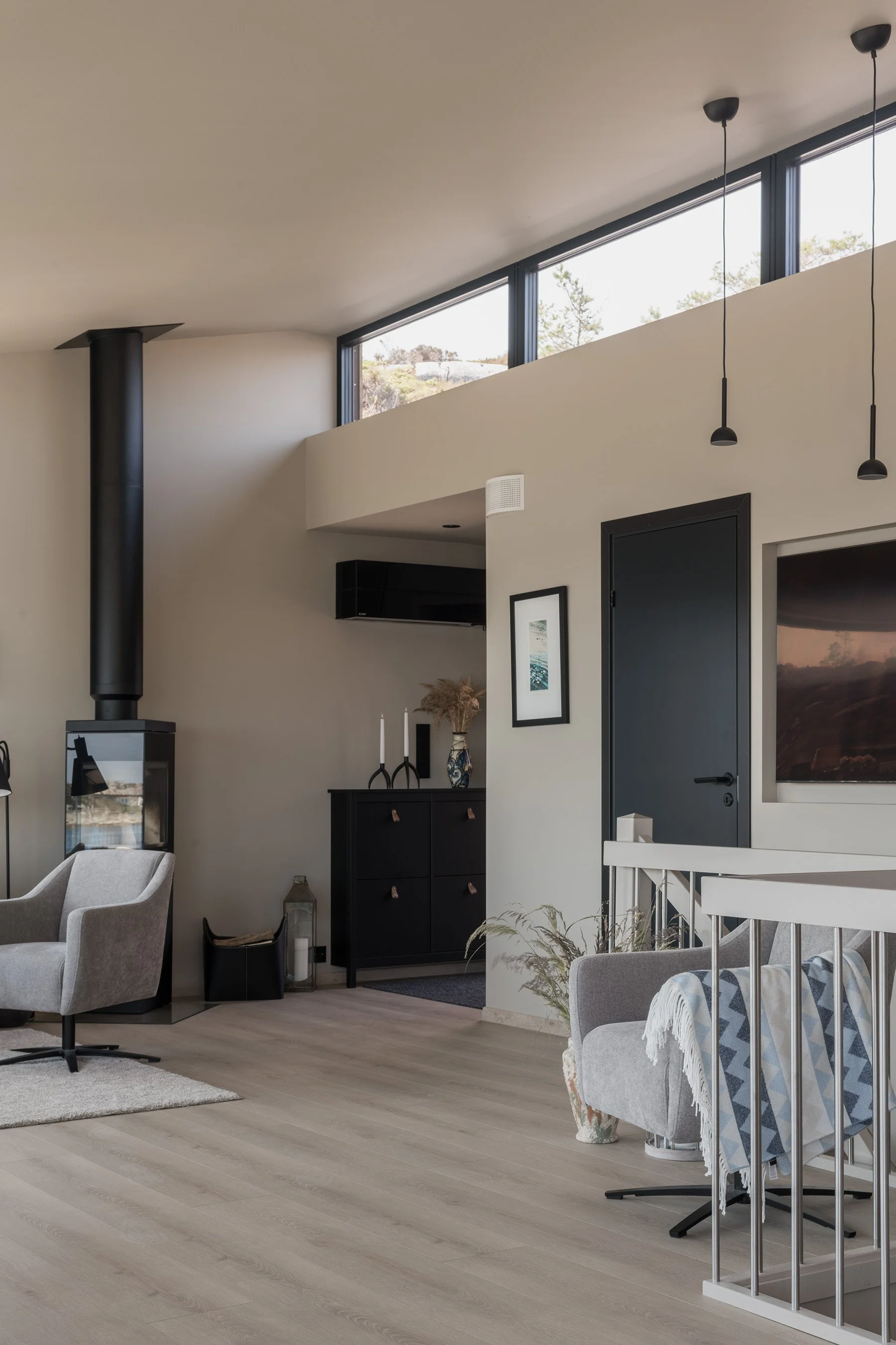 Hytte Høvåg is a cabin nestled in a natural mountain formation in Høvåg, Lillesand. Its roofline mimics sails and boats, while the ground floor connects with the landscape and the lower floor is integrated into the mountain, housing the bedrooms
