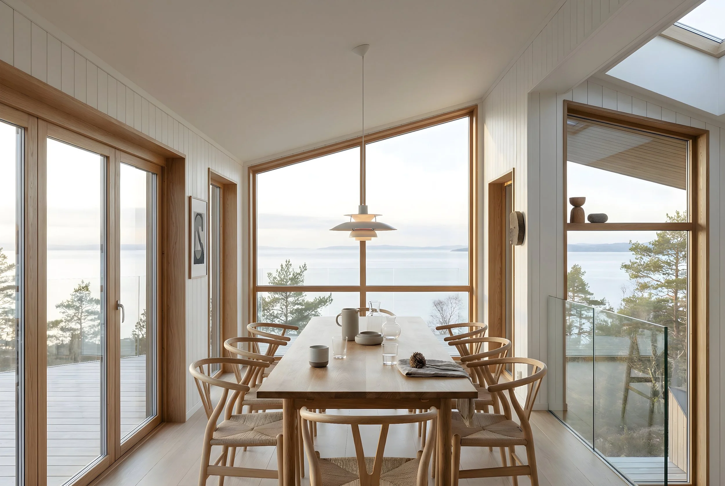 Bygningens volumoppdeling følger terrenget og bryter ned skalaen mot omgivelsene. Forskyvninger i plan og snitt gir varierte romopplevelser og skaper en tydelig overgang mellom private og sosiale soner. Oppholdsrommene er orientert mot utsikt og dagslys, med store vindusflater som knytter interiøret tett til landskapet rundt.